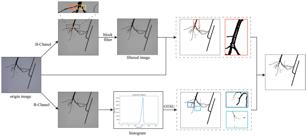 После получения многовидовых изображений целевого объекта с разрешением 1920 × 1080 пикселей с использованием системы захвата изображений, изображения были понижены в разрешении до 960 × 540 пикселей для обеспечения скорости и точности реконструкции. Затем изображения были сегментированы для получения бинарных масок пикселей, отображающих целевой объект на переднем плане. Чтобы обеспечить точность сегментации, использовался контровой свет для увеличения контраста между фоном и целевым объектом. Алгоритм Оцу представляет собой метод выбора порога на основе гистограмм уровней серого [37]. Он подходит для изображений с высоким контрастом. Однако многие образцы корней демонстрировали значительные изменения диаметра корня, и во время вращения корневой системы могли возникать незначительные вибрации; оба этих фактора могли легко привести к неточной сегментации с помощью алгоритма Оцу.