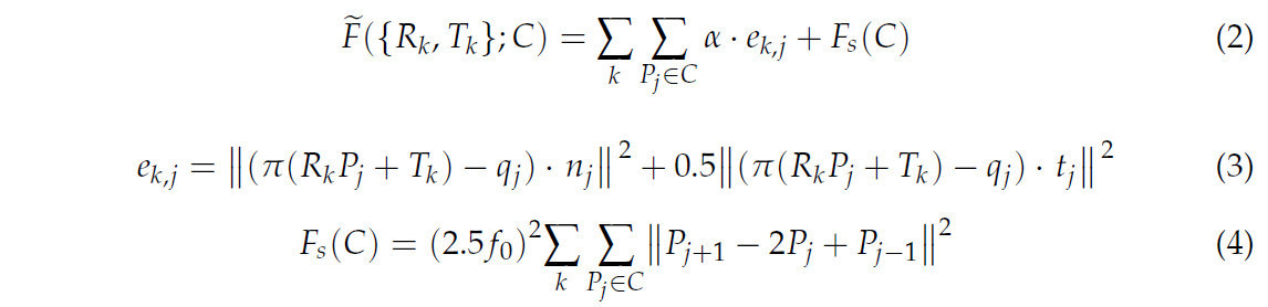 где α = 0, если точка P_j была самоокклюдирована, в противном случае α = 1. e_(k,j) представлял собой ошибку расстояния, n_j представлял собой направление нормали в точке P_j, t_j представлял собой направление касательной в точке P_j. F_s(C) представлял собой член регуляризации, а f_0 представляла собой фокусное расстояние камеры.