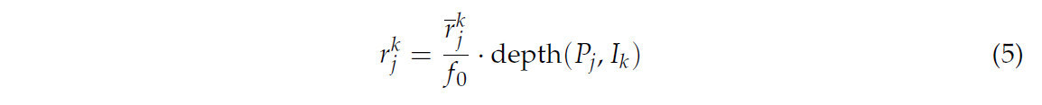где r̅_j^k представляли собой расстояния от проекции точки P_j на каждом виде I_k до обеих сторон определенной полосы, depth(P_j, I_k) представляла собой глубину P_j относительно вида I_k.