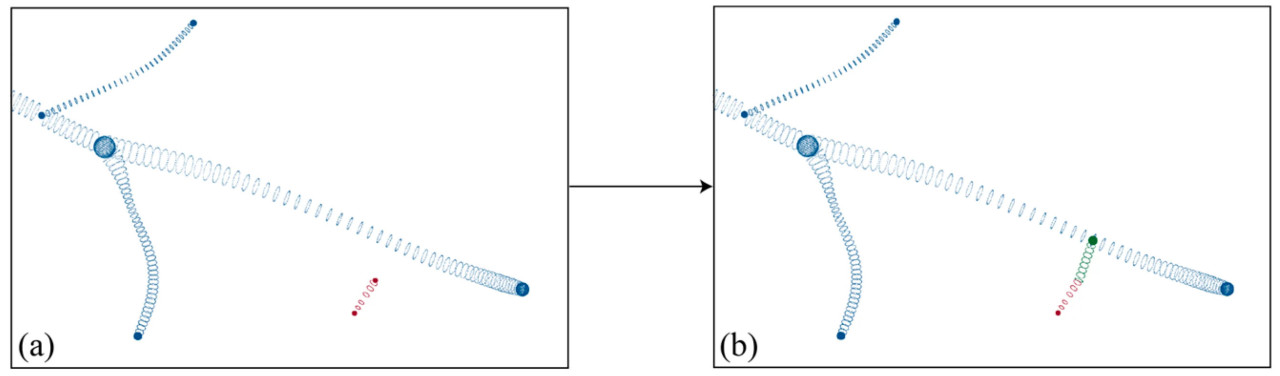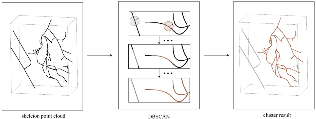 (1) Связность реконструированного облака точек скелета определялась на основе алгоритма DFS (поиска в глубину), разделяя облако точек скелета с отсутствующей областью на независимые облака точек скелета, как на рисунке 8a,b. На основе количества точек независимые скелеты классифицировались на первичный скелет и подскелеты, а также сохранялись все координаты конечных точек, обозначенные в дальнейшем как M = {m_i ∈ R^3, i = 1, 2, ..., n}.