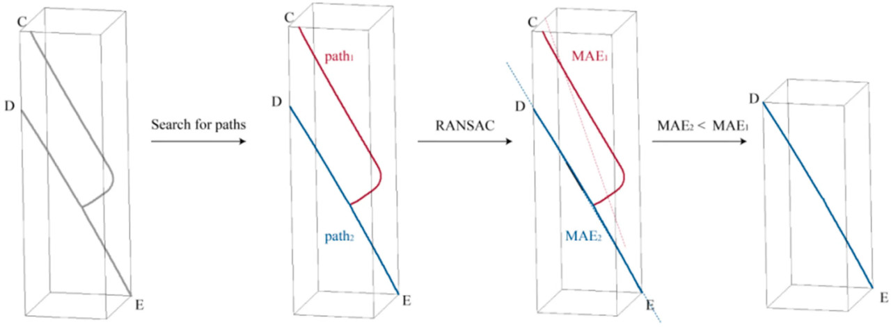 Чтобы вычислить расстояние DE, точки калибровочного объекта необходимо было сегментировать из результатов реконструкции скелета. Для достижения сегментации в этом исследовании применялся метод DBSCAN [39] для кластеризации точек, как показано на рисунке 6, учитывая, что точки были передискретизированы на основе расстояния во время реконструкции. Результат кластеризации классифицировался по количеству точек, и группа с меньшим количеством точек являлась облаком точек калибровочного объекта. Затем, как на рисунке 7, облако точек калибровочного объекта классифицировалось на два пути на основе связности точек, и для двух путей выполнялась линейная аппроксимация на основе RANSAC [40] с вычислением значений средней абсолютной ошибки (MAE). Путь с меньшей MAE идентифицировался как облако точек сегмента DE. Вычислялась длина линии, соединяющей облако точек сегмента DE, и коэффициент масштабирования β выводился с использованием уравнения (6).