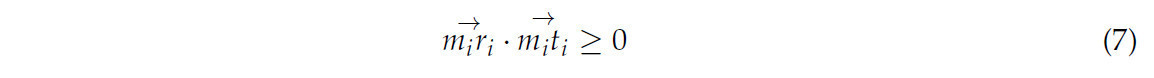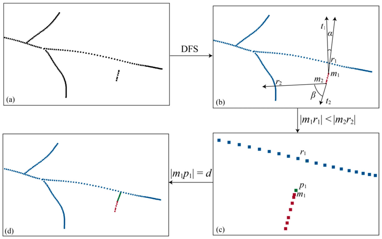 (2) Для каждого подскелета выполнялся итерационный перебор всех конечных точек m_i, и находился вектор касательной (m_i t_i для m_i. Как на рисунке 8b, для каждого m_i перебирались все точки в первичном скелете, чтобы найти точку r_i, удовлетворяющую уравнению (7). Если такая точка находилась, она считалась точкой-кандидатом для соединения, и записывалась длина m_i r_i. После завершения обхода сохранялось кратчайшее m_i r_i в качестве линии соединения, и проверялось, является ли r_i конечной точкой. Если да, она удалялась из множества конечных точек. Чтобы обеспечить равномерное распределение облака точек скелета, точки равномерно дискретизировались вдоль линии соединения m_i r_i с интервалом, равным среднему расстоянию между точками, как на рисунке 8c. В то же время для обеспечения гладкости скелета, если r_i являлась конечной точкой, точки, дискретизированные вдоль m_i r_i, и точки этого подскелета использовались для аппроксимации кривой. Затем точки снова равномерно дискретизировались вдоль кривой, и дискретизированные точки добавлялись к точкам скелета. После обхода всех подскелетов восстановление точек скелета было завершено, как показано на рисунке 8d.