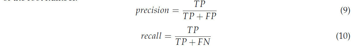 где TP являлось количеством правильно реконструированных корней в результате реконструкции, FP являлось количеством неправильно реконструированных корней в результате реконструкции, а FN являлось количеством корней, которые не были реконструированы в результате реконструкции.