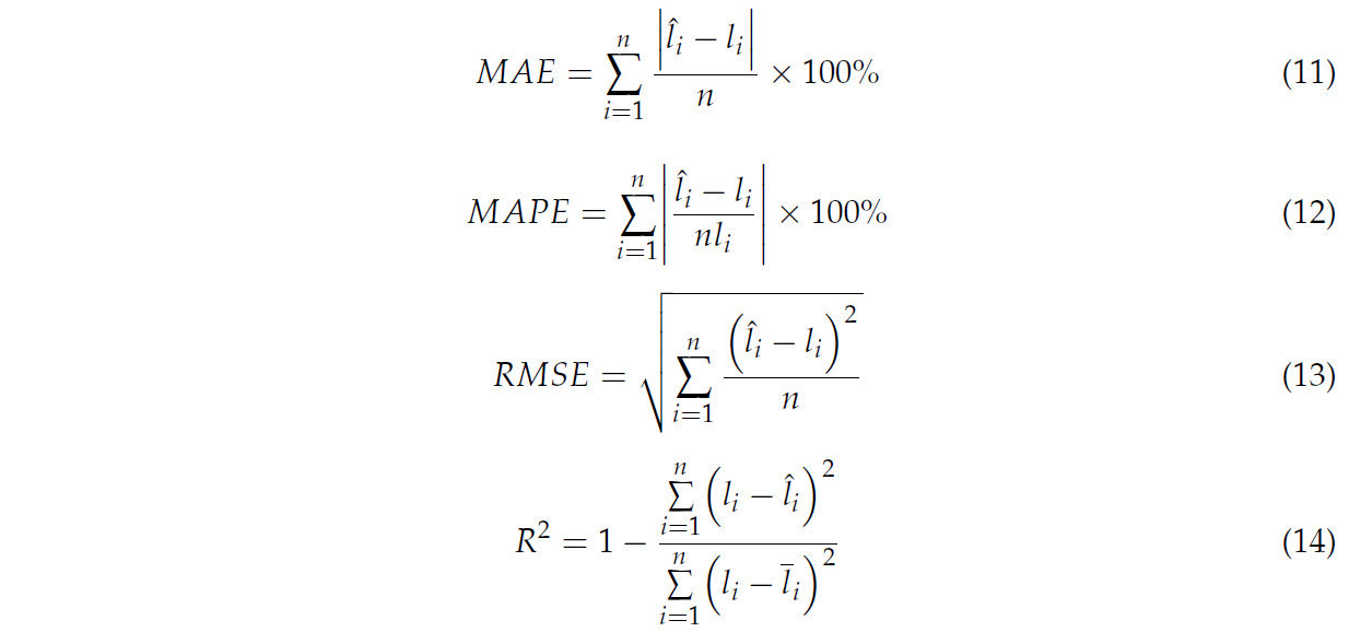 Длина корней измерялась как длина скелетных линий в сочетании с коэффициентом масштабирования β. Точность измерения длины корней оценивалась с помощью MAE (уравнение (11)), средней абсолютной процентной ошибки (MAPE, уравнение (12)), среднеквадратичной ошибки (RMSE, уравнение (13)) и коэффициента детерминации (R², уравнение (14)).