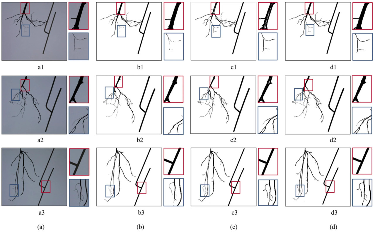 Рисунок 10. Результат сегментации: (a) исходное изображение, (b) сегментация Оцу, (c) сегментация прямоугольным фильтром, (d) предложенная адаптивная пороговая сегментация на основе Оцу. (a1–d1) показывают исходное изображение и результаты сегментации, когда диаметр корня образца сильно изменялся. (a2–d2) показывают исходное изображение и результаты сегментации при наличии незначительной вибрации во время сбора изображений. (a3–d3) показывают исходное изображение и результаты сегментации, когда образец имел много мочковатых корней.