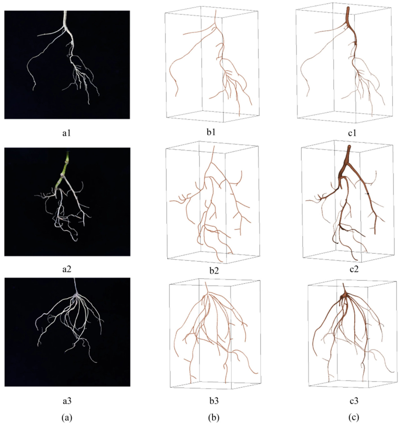 Рисунок 11. Результат трехмерной реконструкции корневой системы: (a) RGB-изображение корневой системы, (b) результат 3D-реконструкции скелета корневой системы, (c) результат 3D-реконструкции поверхности корневой системы. (a1–c1) показывают RGB-изображение и результат реконструкции корневой системы Ocimum basilicum. (a2–c2) показывают RGB-изображение и результат реконструкции корневой системы Sarcandra glabra. (a3–c3) показывают RGB-изображение и результат реконструкции корневой системы Scutellaria barbata.