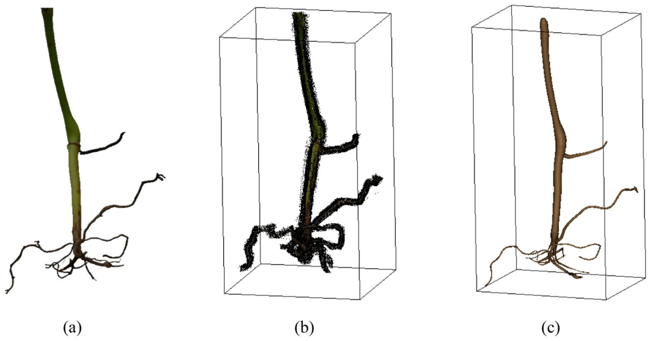 Рисунок 13. Сравнение с COLMAP: (a) изображение корневой системы, (b) результат 3D-реконструкции с использованием COLMAP, (c) результат 3D-реконструкции с использованием предложенного метода.