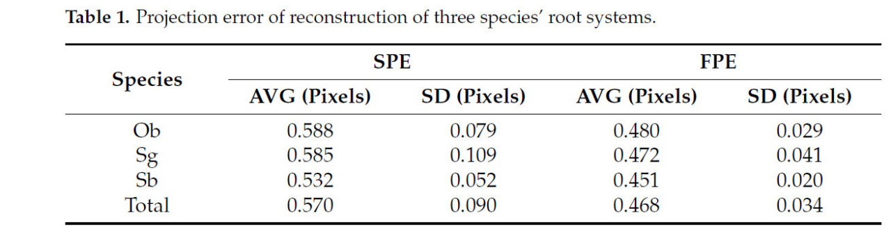 В этом исследовании в эксперименте по реконструкции было использовано в общей сложности 30 корней проростков, включая 9 корней Ob, 13 корней Sg и 8 корней Sb. В таблице 1 описаны среднее значение и стандартное отклонение ошибок проекции результатов реконструкции для трех видов корневых систем. SPE и FPE реконструкций трех видов корней были менее 0.6 пикселя, а стандартное отклонение также было менее 0.2 пикселя, что указывает на высокую точность реконструкции и хорошую стабильность.