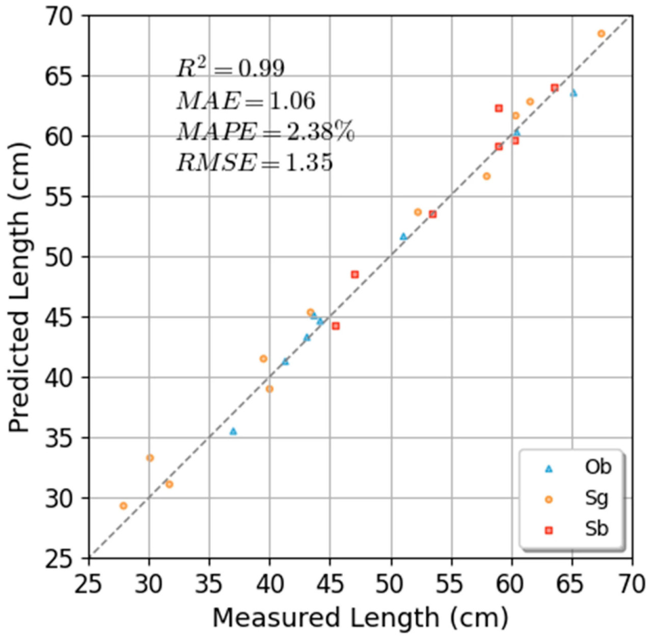 В таблице 2 описана производительность измерения количества корней и длины корней на 26 образцах. Количество корней в образцах варьировалось от 10 до 27, а точность (precision) и полнота (recall) измерения количества корней по результатам реконструкции достигли 0.97 и 0.96. Почти в одной трети результатов измерения количества корней были достигнуты точность 1 и полнота 1, а FN (ложноотрицательные) и FP (ложноположительные) в других результатах измерений также не превышали 2. Длина корней в образцах варьировалась от 27.90 см до 67.50 см, и результаты измерений для всех образцов достигли MAE 1.06 см, MAPE 2.38% и RMSE 1.35 см. На рисунке 14 показана зависимость между измеренной длиной корней и реальными значениями для каждого образца. Вычисленный R² между предсказанными значениями и реальными значениями составил 0.99 для Ob, 0.99 для Sg, 0.96 для Sb и 0.99 для всех образцов, в то время как в работе [41] был достигнут R² 0.92, а в работе [28] — R² 0.92. Параметры, измеренные по результатам 3D-реконструкции, показали высокую точность по сравнению с соответствующими ручными измерениями. В результатах эксперимента было обнаружено, что самоокклюзия корневой системы по-прежнему являлась основной причиной ошибки. Это может быть улучшено в будущих исследованиях путем использования адаптивного метода сбора данных для получения более детальной информации о корневой системе и улучшения результатов реконструкции.