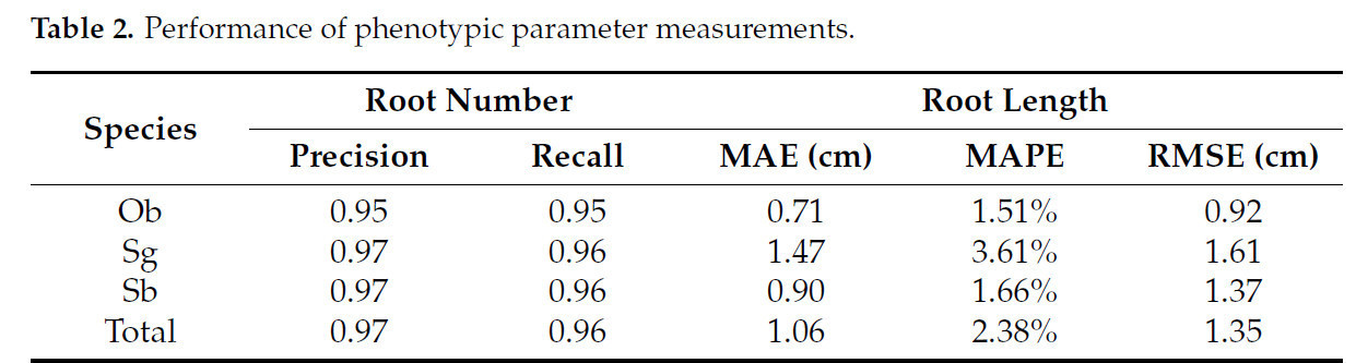 В этом исследовании измерялись количество корней и длина корней, выбранные в качестве фенотипических параметров. Количество корней определялось путем подсчета числа конечных точек в результате реконструкции. Точность (precision) и полнота (recall) были вычислены для оценки смещения в определении количества корней.