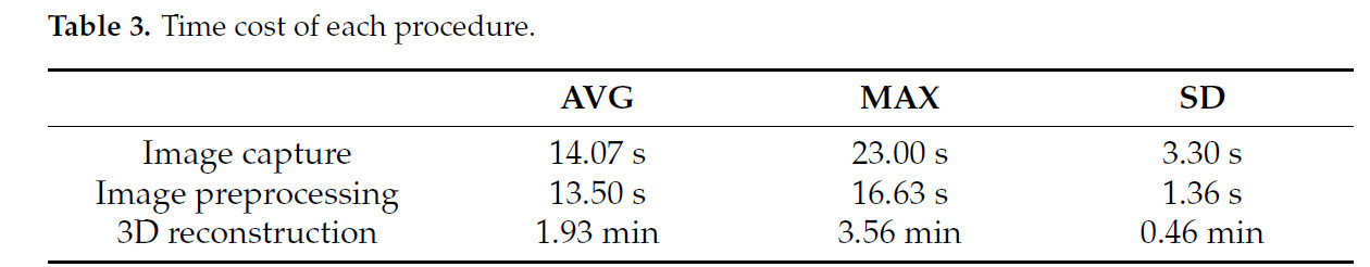 В таблице 3 показаны временные затраты на каждый этап предложенного процесса реконструкции в этом исследовании. Процесс реконструкции был разделен на три стадии: сбор изображений, предварительная обработка изображений и 3D-реконструкция. Количество входных изображений варьировалось от 150 до 250, а среднее время, затраченное на захват этих изображений, составило 14.03 секунды. Максимальное время предварительной обработки изображений было менее 17 секунд, и продолжительность в основном зависела от количества изображений. Время 3D-реконструкции было самым продолжительным, относительно, со средним значением 1.93 минуты и максимумом 3.56 минуты, в основном в зависимости от количества изображений. Весь процесс занимал максимум 4.07 минуты. Короткое время, затрачиваемое этим методом, было в основном связано с понижением разрешения изображения, а итеративный процесс в основном использовал бинарные изображения, обработанные методами истончения. Чтобы повысить точность реконструкции, обеспечивая при этом низкие временные затраты на реконструкцию, в будущем будут проведены исследования по сокращению временных затрат на реконструкцию изображений с высоким разрешением.