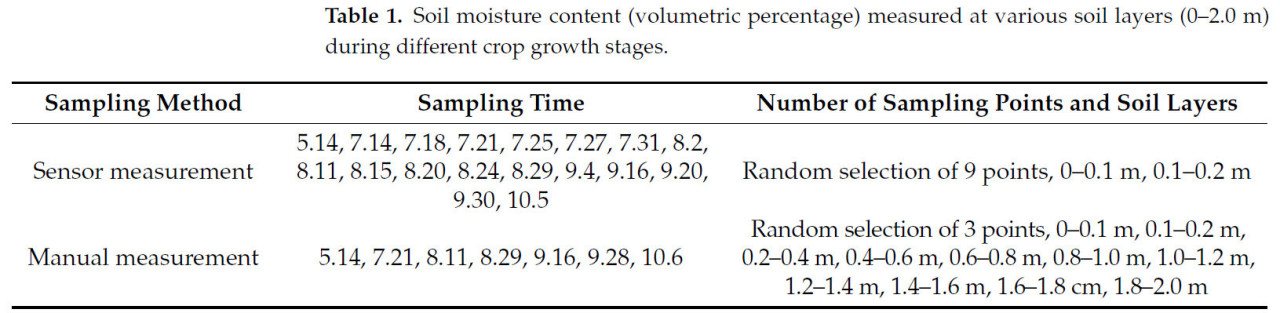 Кукуруза была посеяна 15 мая 2023 года, всходы появились в период с 20 по 22 мая, а уборка урожая была проведена 4 октября. На протяжении всего периода вегетации для измерения объемной влажности почвы в профиле 0–2,0 м использовалась комбинация ручного отбора проб и мониторинга на основе датчиков (Таблица 1). Объемная влажность верхнего слоя почвы (0–20 см) отслеживалась в реальном времени с помощью портативного датчика температуры и влажности RS485, измерения проводились в девяти случайным образом распределенных точках по полю. Для подпочвенного слоя (20–200 см) гравиметрическая влажность определялась с помощью методов бурения и отбора проб почвы. Образцы почвы отбирались с интервалом 20 см от поверхности до глубины 200 см с использованием алюминиевых контейнеров, и их вес записывался. Затем гравиметрическая влажность измерялась стандартным методом сушки в печи, а соответствующая плотность сложения каждого слоя почвы использовалась для расчета объемной влажности. Во время каждого сеанса мониторинга выбирались три случайные точки на поле для измерения влажности почвы по всему профилю 0–2,0 м.
