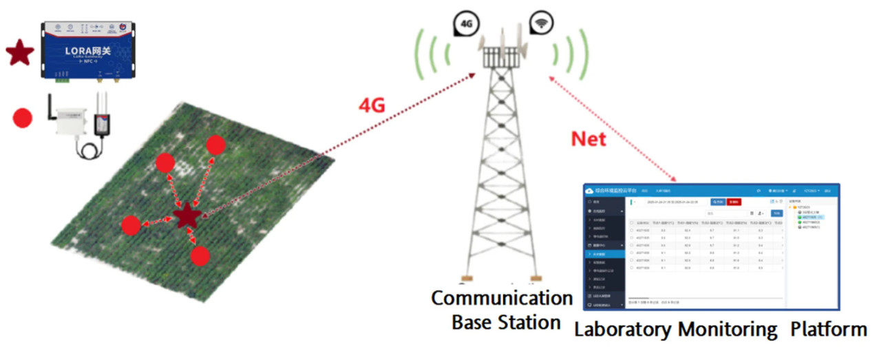 Для непрерывного мониторинга влажности почвы в верхнем слое (0–20 см) сельскохозяйственных угодий была разработана недорогая система дистанционного мониторинга на основе технологии беспроводной связи LoRa (Рисунок 2). Система состоит из беспроводных датчиков влажности почвы (датчики температуры и влажности типа RS485) и системы связи LoRa, включающей шлюз, серверный уровень и уровень передачи данных. Эти компоненты обеспечивают управление несколькими датчиками влажности почвы в верхнем слое почвы и связь с ближайшей наземной базовой станцией 4G. Облачная платформа лаборатории принимает данные в реальном времени, предоставляя динамическую информацию о влажности почвы с каждой точки мониторинга.