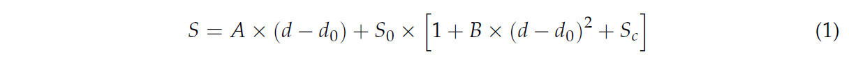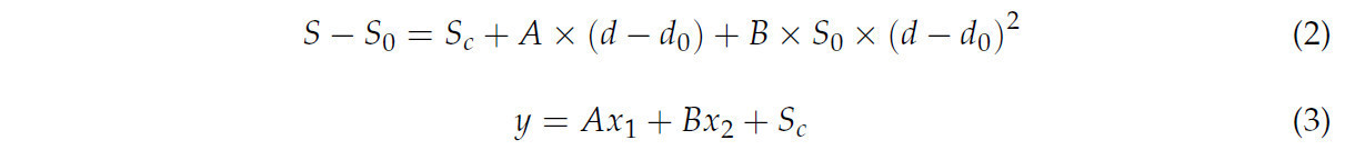 Точная оценка параметров A, B и S_c имеет важнейшее значение для надежного применения модели. Для облегчения параметризации и практического использования мы преобразовали Уравнение (1) в модель множественной линейной регрессии с помощью замены переменных (Уравнение (2)). Установив y = S - S₀, x₁ = d - d₀, x₂ = S₀ × (d - d₀)², Уравнение (2) становится моделью двумерной линейной регрессии (Уравнение (3)).