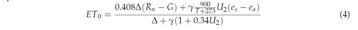 Мы рассчитали эвапотранспирацию эталонной культуры (ET₀), используя уравнение Пенмана-Монтейта FAO56 (уравнение PM), рекомендованное Продовольственной и сельскохозяйственной организацией Объединенных Наций (FAO), которое является стандартным методом для оценки ET₀ (Уравнение (4)) [34,35]. Метеорологические данные были получены с метеостанции на экспериментальном участке.