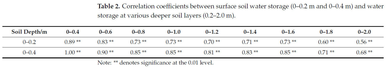 Аналогично, запасы влаги в слое 0–0,4 м показывают значительные корреляции со всеми более глубокими слоями почвы, причем наибольшая корреляция наблюдается на глубине 0–0,6 м (коэффициент корреляции = 0,90). Эта тенденция свидетельствует о том, что немного более толстый поверхностный слой почвы лучше отражает динамику влажности почвы. Как и в случае со слоем 0–0,2 м, корреляция слоя 0–0,4 м также ослабевает с глубиной, достигая 0,68 на глубине 2,0 м, хотя общая корреляция остается значимой.