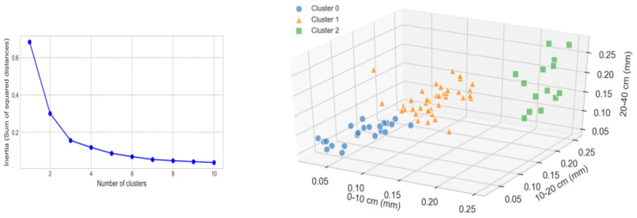 Для учета этих вариаций мы выбрали три поверхностных слоя почвы (0–0,1 м, 0,1–0,2 м и 0,2–0,4 м) в качестве индикаторов, представляющих характеристики влажности почвы для каждого профиля отбора проб. В общей сложности 75 почвенных профилей были классифицированы с использованием метода локтя — эвристической техники кластеризации — на основе значений запасов влаги трех поверхностных слоев (Рисунок 3). Профили были разделены на три отдельных класса: Класс 1 (22 образца), Класс 2 (39 образцов) и Класс 3 (14 образцов). Все образцы также были объединены в Класс 4 для всестороннего анализа.