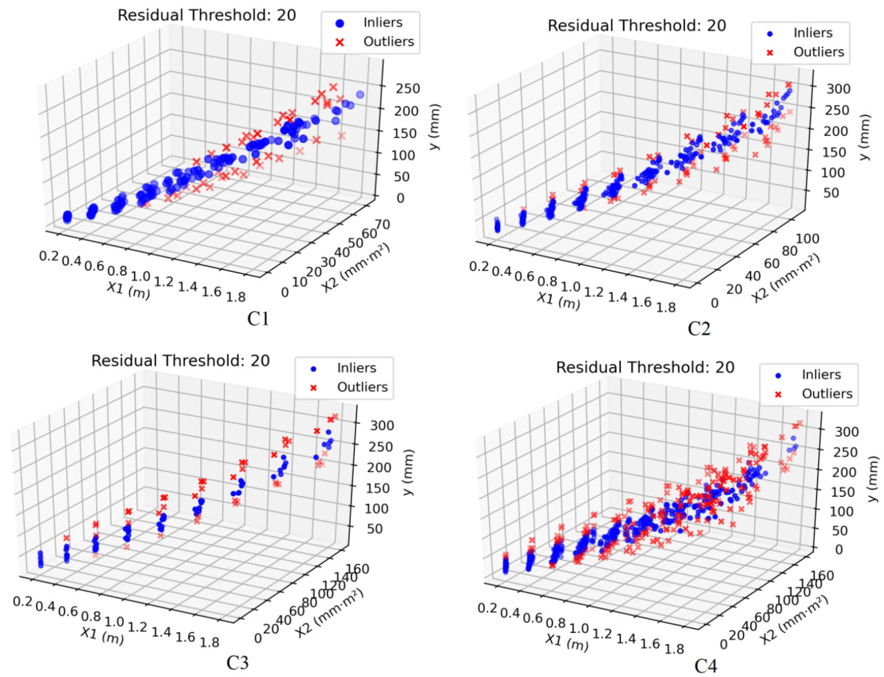 Модуль RANSAC был выполнен в течение 10 000 итераций, все остальные параметры были установлены на оптимальные значения по умолчанию для обеспечения стабильности и точности идентификации выбросов. После обработки примерно 5,6% исходного набора данных были идентифицированы как выбросы и впоследствии удалены из анализа. Эта доля является разумной, учитывая неизбежный шум окружающей среды и периодические ошибки датчиков, возникающие при сборе полевых данных.