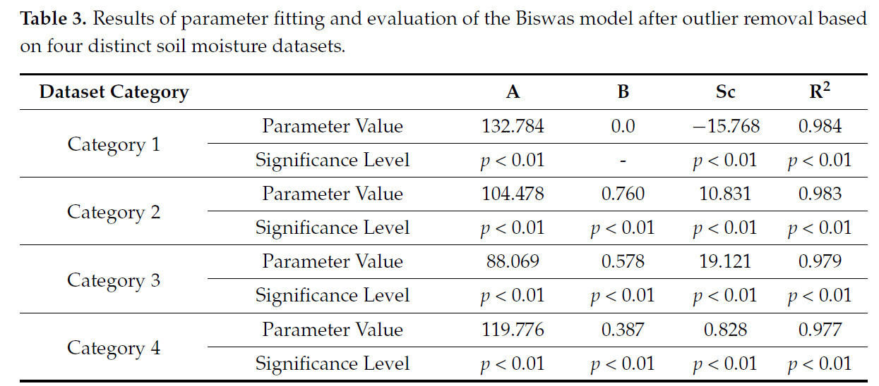 Таблица 3. Результаты подгонки параметров и оценки модели Бисваса после удаления выбросов на основе четырех различных наборов данных о влажности почвы.