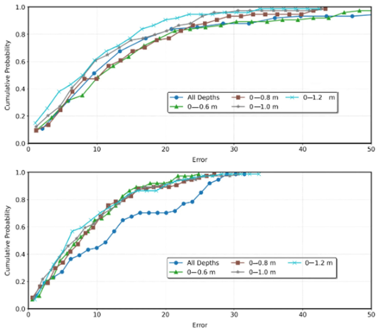 Рисунок 5. Кумулятивное распределение вероятностей относительных ошибок между прогнозируемыми и измеренными значениями влажности почвы на разных глубинах (0–0,2 м, 0,2–0,4 м и более глубокие слои). Рисунок иллюстрирует точность модели Бисваса в прогнозировании динамики влажности почвы, где в качестве метрики оценки используется относительная ошибка (%).