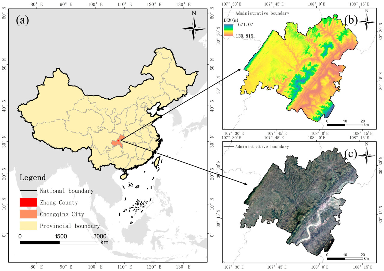 Это исследование фокусируется на уезде Чжунсянь в муниципалитете Чунцин, Китай. Район исследования расположен в восточной части Чунцина и среднем и верхнем течении реки Янцзы, его координаты: 107°30′–108°06′ в.д. и 30°03′–30°33′ с.ш. Регион характеризуется теплым, влажным горным климатом в субтропической юго-восточной муссонной зоне, что благоприятно для сельского хозяйства (Рисунок 1). Рельеф в основном представлен холмами и низкими горами со значительными перепадами высот, в среднем от 200 до 800 м. Сельскохозяйственные земли в основном расположены в речных долинах, на равнинных участках и пологих склонах, отличаясь фрагментированностью и неправильной формой, характерными для горных регионов. Этот сложный рельеф и фрагментированное распределение земель создают трудности для идентификации земель, но также предоставляют отличную платформу для применения методов глубокого обучения в дистанционном зондировании для идентификации сельскохозяйственных угодий.
