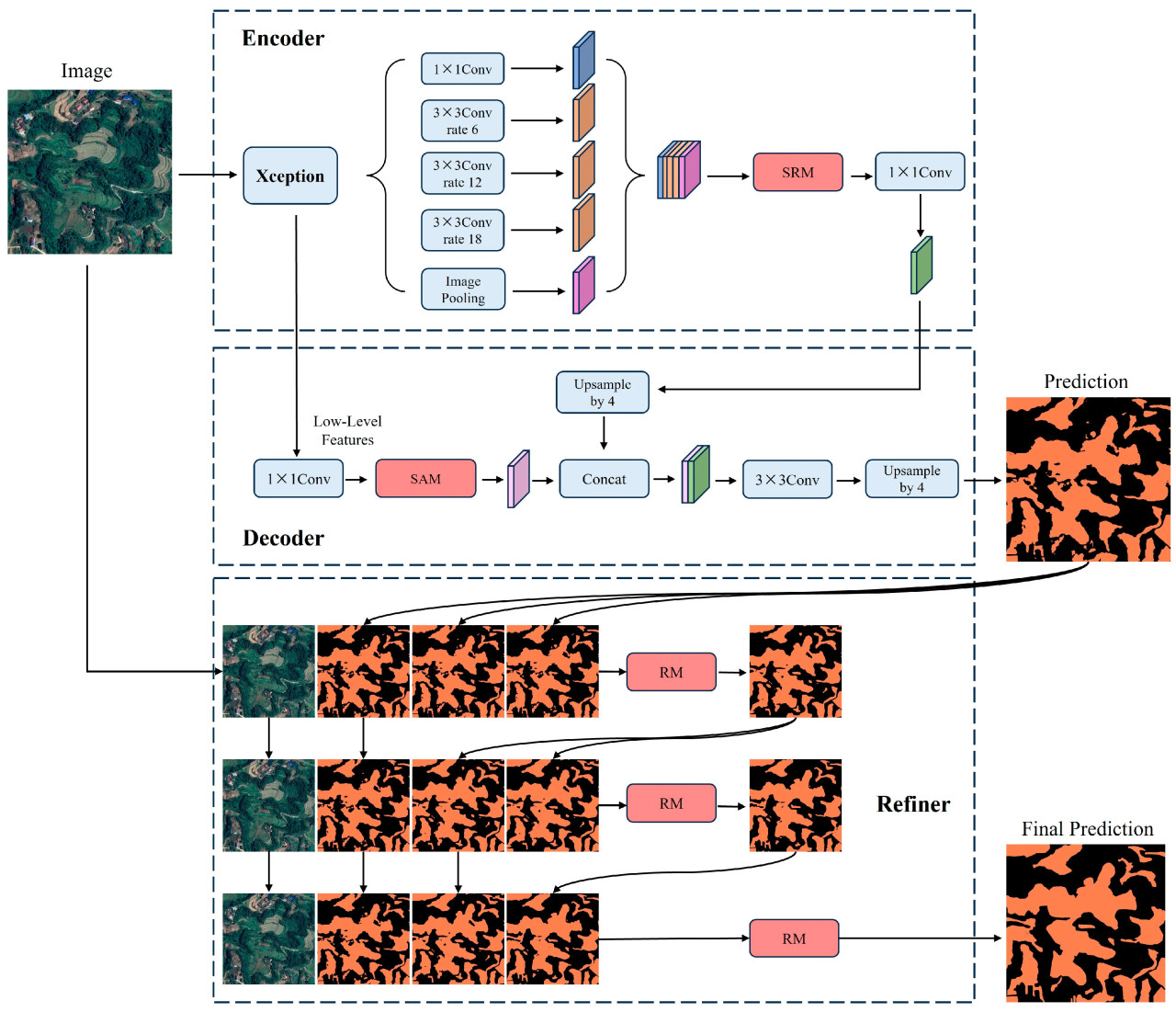 Во-первых, кодировщик использует Xception в качестве магистральной сети для извлечения признаков, за которой следует модуль ASPP (Atrous Spatial Pyramid Pooling) для захвата более богатой многомасштабной информации для более детального извлечения признаков. SRM внутри модуля ASPP улучшает фокусировку сети и интеграцию многомасштабной информации. Во-вторых, модуль декодировщика объединяет признаки высокого и низкого уровня и включает модуль пространственного внимания, позволяющий модели концентрироваться на важных признаках, таких как местоположение и текстура сельскохозяйственных земель. Затем начальная маска результата генерируется с использованием заголовка классификации.