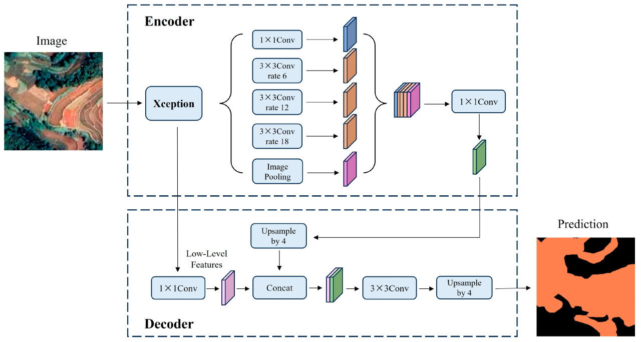 29. Chen, L.-C.; Zhu, Y.; Papandreou, G.; Schroff, F.; Adam, H. Encoder-decoder with atrous separable convolution for semantic image segmentation. In Proceedings of the European Conference on Computer Vision (ECCV), Munich, Germany, 8–14 September 2018; pp. 801–818. [Google Scholar]