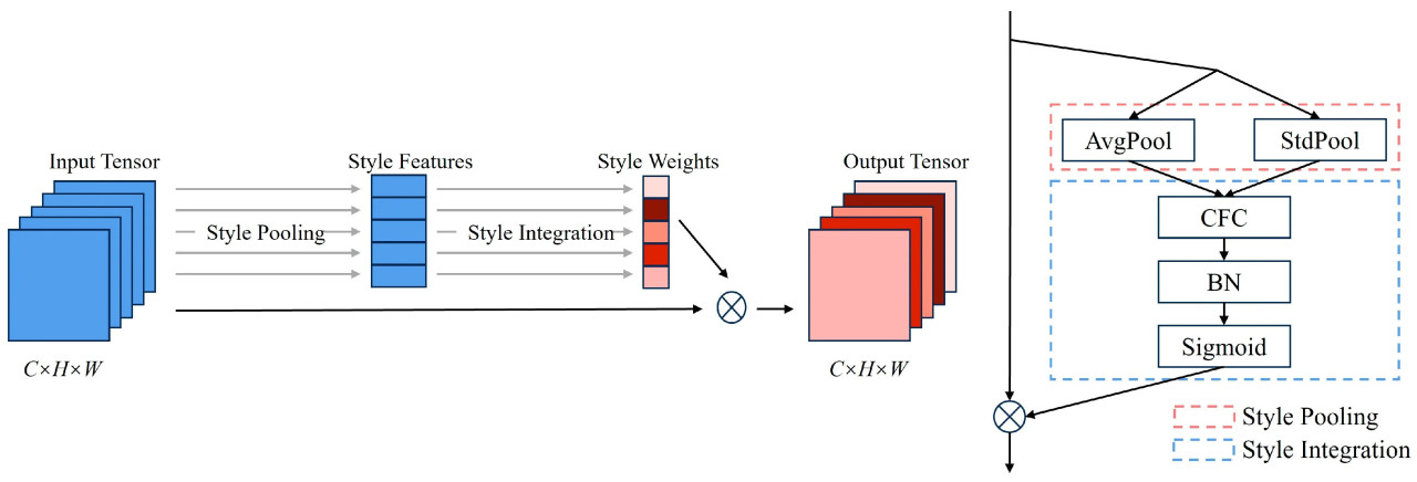 Модуль стилевой перекалибровки (SRM) — это передовой метод нейронных сетей, который улучшает возможности представления признаков сверточных нейронных сетей (CNN) [30]. SRM повышает дискриминационную способность модели путем перекалибровки отклика каждого канала признаков и интеграции информации о стиле в процесс извлечения признаков. В частности, SRM вводит адаптивный механизм для регулировки весов каналов на основе характеристик входных данных, включая глобальное среднее объединение, межканальные корреляции и нелинейные функции активации. Эта динамическая регулировка распределения карт признаков позволяет SRM более эффективно захватывать и использовать критическую информацию из входных изображений, повышая производительность в различных задачах компьютерного зрения. Структура модуля показана на Рисунке 5.