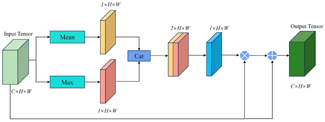 Модуль пространственного внимания (SAM) — это широко используемый метод в глубоком обучении, особенно в компьютерном зрении, предназначенный для улучшения извлечения признаков путем присвоения различных весов внимания в пространственном измерении [31]. Основная идея заключается в повышении способности модели распознавать и локализовать целевые объекты путем изучения важности каждой позиции на входной карте признаков, выделяя ключевые области и подавляя нерелевантный фон. SAM обычно использует операции свертки для вычисления оценки важности каждого местоположения на карте признаков, генерируя улучшенную карту признаков путем взвешенного слияния с исходной картой признаков. Этот механизм значительно улучшает производительность и устойчивость модели, а также обеспечивает более интуитивно понятную интерпретацию, делая процесс принятия решений более прозрачным. Исследования показывают, что механизмы пространственного внимания превосходно работают в различных задачах визуального анализа, таких как классификация изображений, обнаружение объектов и сегментация изображений, что подтверждает их эффективность и широкую применимость. Структура модуля показана на Рисунке 6.