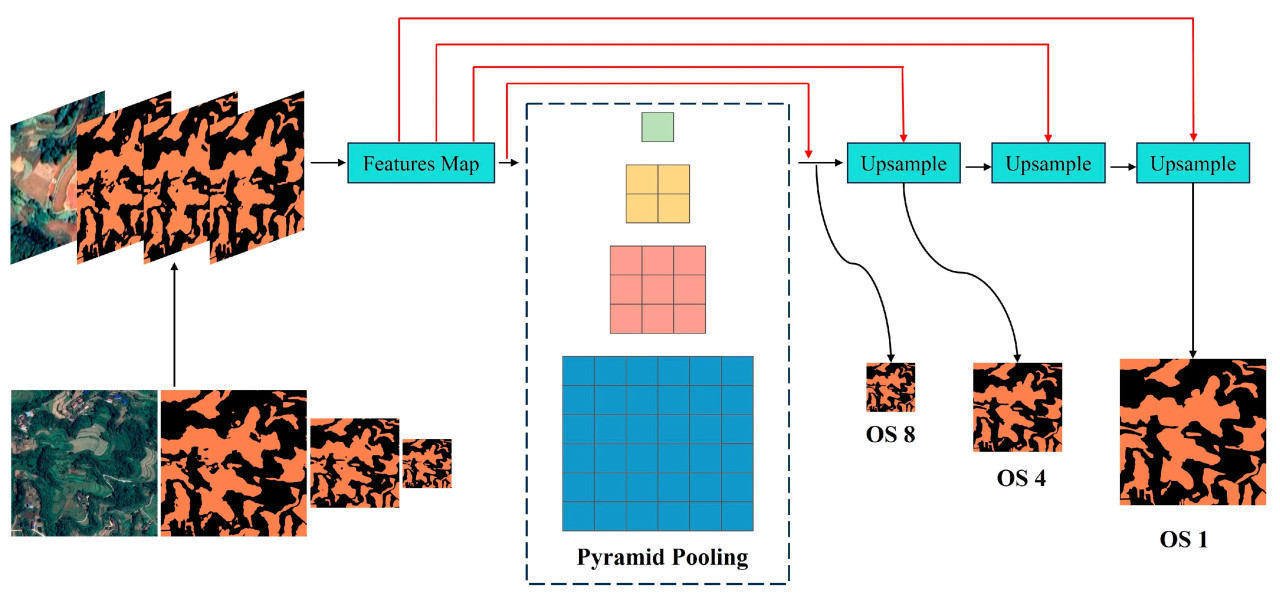 Однако существующие универсальные модели компьютерного зрения не разработаны специально для спутниковых снимков, и их прямое применение к задаче выделения сельскохозяйственных земель на спутниковых изображениях часто приводит к неудовлетворительным результатам выделения, таким как неверная классификация краев, наличие отверстий и шум [24]. Эти проблемы особенно серьезны в горных районах, где сельскохозяйственные угодья имеют неправильную форму и фрагментированы. Существующие решения этих проблем обычно делятся на две категории: одна включает методы постобработки (такие как расширение, эрозия и сглаживание) для оптимизации морфологии и решения проблемы отверстий [25]; другая включает многозадачные параллельные сетевые структуры, где основная сеть отвечает за идентификацию сельскохозяйственных земель, а вспомогательные сети используются для обнаружения краев, при этом признаки краев объединяются с признаками сельскохозяйственных земель для направления процесса выделения [26,27]. Хотя эти методы успешно применяются на равнинной местности, они по-прежнему сталкиваются с трудностями в сложных горных условиях. Методам постобработки не хватает динамической адаптируемости, и они сильно полагаются на априорные знания, в то время как методы выделения, управляемые краями, зависят от точности определения границ, что трудно достичь в горных районах из-за сложной морфологии земель и размытых границ.