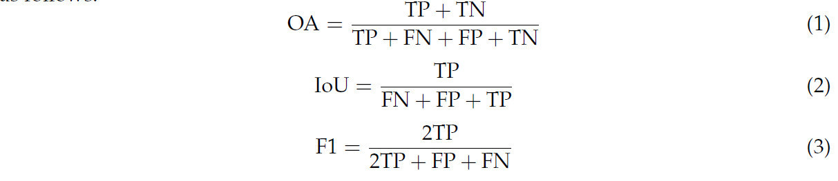 Для оценки производительности модели в задаче выделения сельскохозяйственных земель мы выбрали несколько метрик точности, обычно используемых в семантической сегментации: общую точность (OA), пересечение по объединению (IoU) и F1-меру. OA измеряет глобальную точность классификации пикселей, рассчитываемую как отношение правильно классифицированных пикселей к общему количеству пикселей. Однако в случаях дисбаланса классов одной OA может быть недостаточно. Например, если несельскохозяйственные области значительно превосходят по площади сельскохозяйственные, высокая OA может в основном отражать правильную классификацию несельскохозяйственных областей, игнорируя сельскохозяйственные. Таким образом, для всесторонней оценки производительности модели необходимы дополнительные метрики; IoU количественно определяет перекрытие между предсказанной и фактической сегментацией. Более высокий IoU указывает на лучшее перекрытие между предсказанными и фактическими областями сельскохозяйственных земель, предлагая точную меру точности сегментации модели. Более того, IoU устойчив к дисбалансу данных и обеспечивает объективную оценку производительности, даже когда размеры выборок сельскохозяйственных и несельскохозяйственных земель значительно различаются; F1-мера является средним гармоническим между полнотой и точностью. Точность измеряет долю предсказанных областей сельскохозяйственных земель, которые классифицированы правильно, в то время как полнота показывает долю фактических сельскохозяйственных земель, правильно идентифицированных. В идеале мы хотим, чтобы модель точно идентифицировала все сельскохозяйственные земли (высокая полнота) и минимизировала ошибочную классификацию несельскохозяйственных земель как сельскохозяйственных (высокая точность). F1-мера обеспечивает оптимальный баланс между ними, причем более высокие значения указывают на лучший компромисс между точностью и полнотой. Эти метрики обеспечивают всестороннюю оценку производительности модели, отражая ее точность, надежность и согласованность с разных точек зрения. Формулы для расчета этих метрик следующие:
