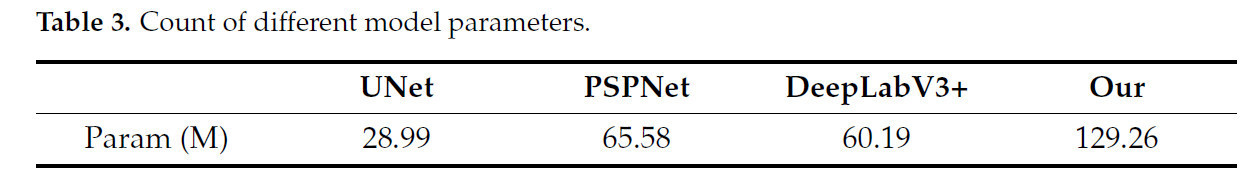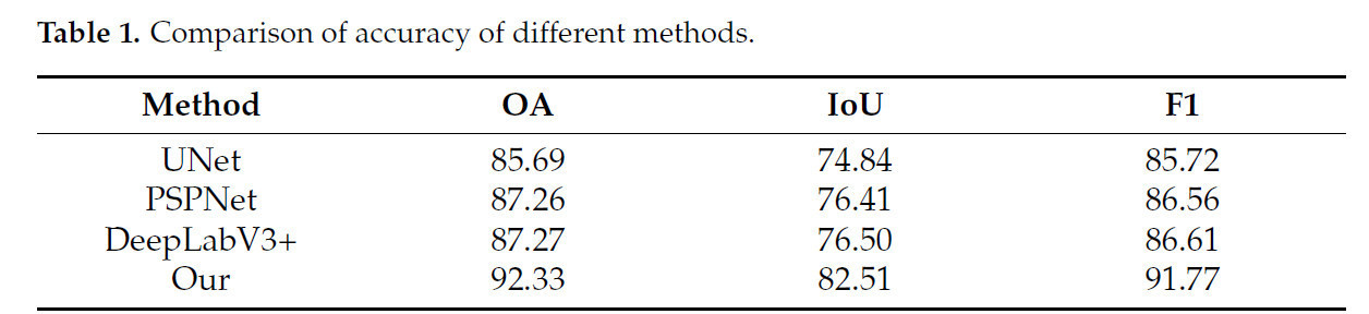 Чтобы оценить эффективность нашего предложенного метода, мы провели сравнительные эксперименты с широко используемыми методами выделения сельскохозяйственных земель, а именно UNet, PSPNet и DeepLabV3+. UNet использует структуру кодировщика-декодировщика для захвата многомасштабной информации о признаках, что делает ее подходящей для изображений с богатыми деталями. PSPNet захватывает глобальную многомасштабную контекстную информацию через модуль пирамидального объединения, хорошо работая на сложных фонах с изменяющимися размерами объектов. DeepLabV3+ объединяет расширенную свертку со структурой кодировщика-декодировщика, преуспевая в восстановлении деталей и обработке границ. Все модели обучались с одинаковыми параметрами: размер пакета 12, 100 эпох и оптимизатор SGD.
