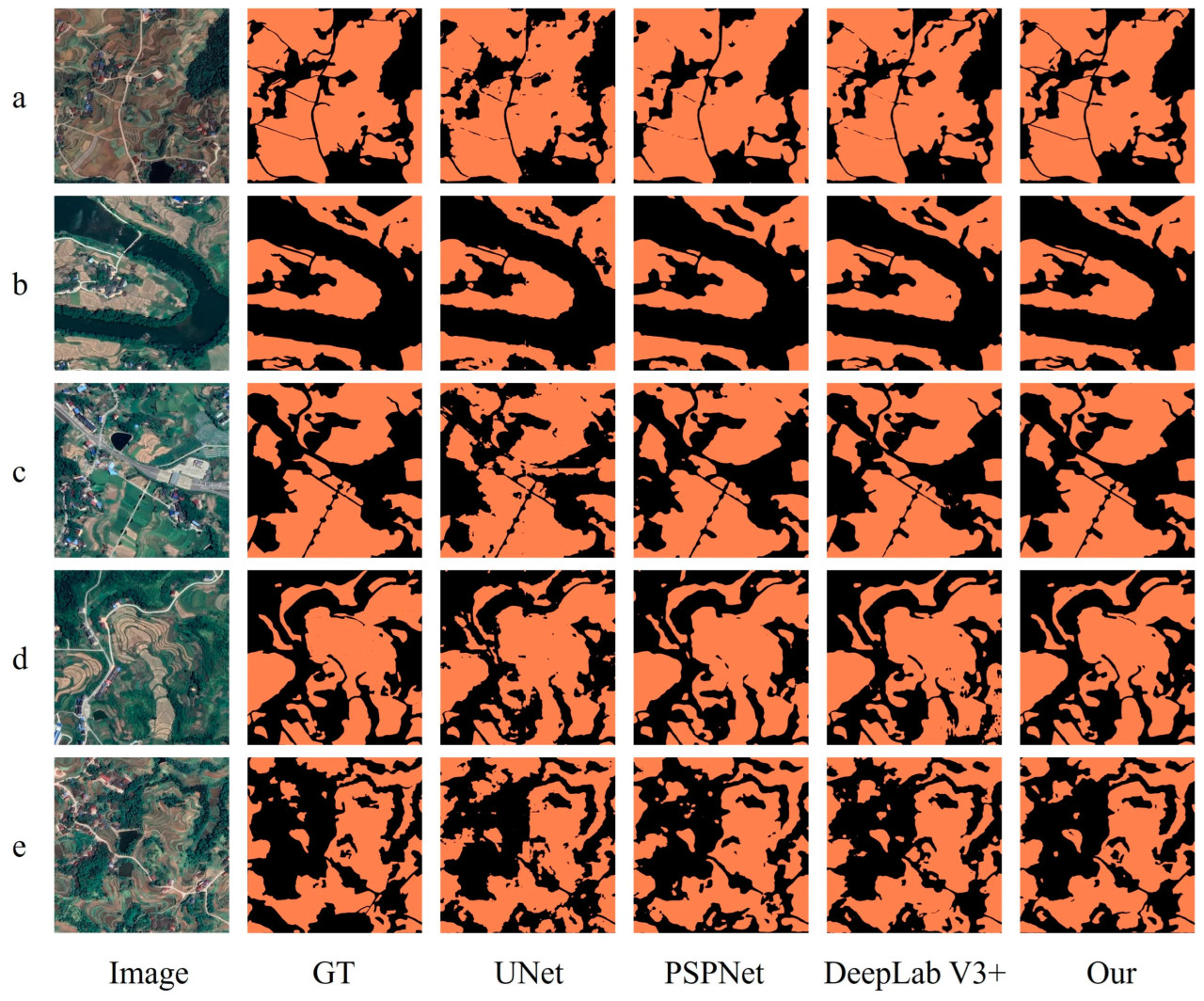 Это исследование было сфокусировано на горном регионе южного Китая, используя спутниковые снимки высокого разрешения для точного выделения информации о сельскохозяйственных землях на сложном рельефе. В отличие от методов сбора данных с помощью БПЛА [33], в этом исследовании используются спутниковые снимки для масштабного выделения земель, что обеспечивает более широкий потенциал применения. Предыдущие исследования повышали точность выделения сельскохозяйственных земель путем разработки функций потерь комбинированного типа с усилением краев и ограничениями, а также внедрения механизмов поляризованного самовнимания [26,34]. Хотя эти методы достигли высокой точности, они в основном применялись на равнинных территориях. В нашем исследовании мы улучшили DeepLabV3+, интегрировав SAM, SRM и каскадный RM, повысив точность модели для выделения сельскохозяйственных земель на сложном рельефе. Используя нашу улучшенную модель со спутниковыми данными высокого разрешения, мы достигли OA 92,33% и IoU 82,51% при выделении сельскохозяйственных земель. Наши результаты по сравнению с результатами других исследований [26,34] показывают незначительные различия в производительности, главным образом из-за уникальных характеристик нашего района исследования. В то время как другие исследования были сосредоточены на равнинах, наша работа направлена на решение проблем сложного рельефа южного горного региона. Несмотря на несколько более низкую точность, наши результаты остаются сопоставимыми и демонстрируют отличную применимость в конкретных сценариях.