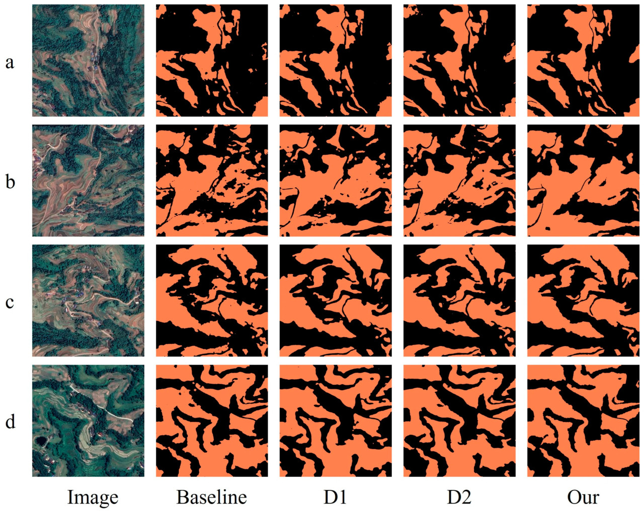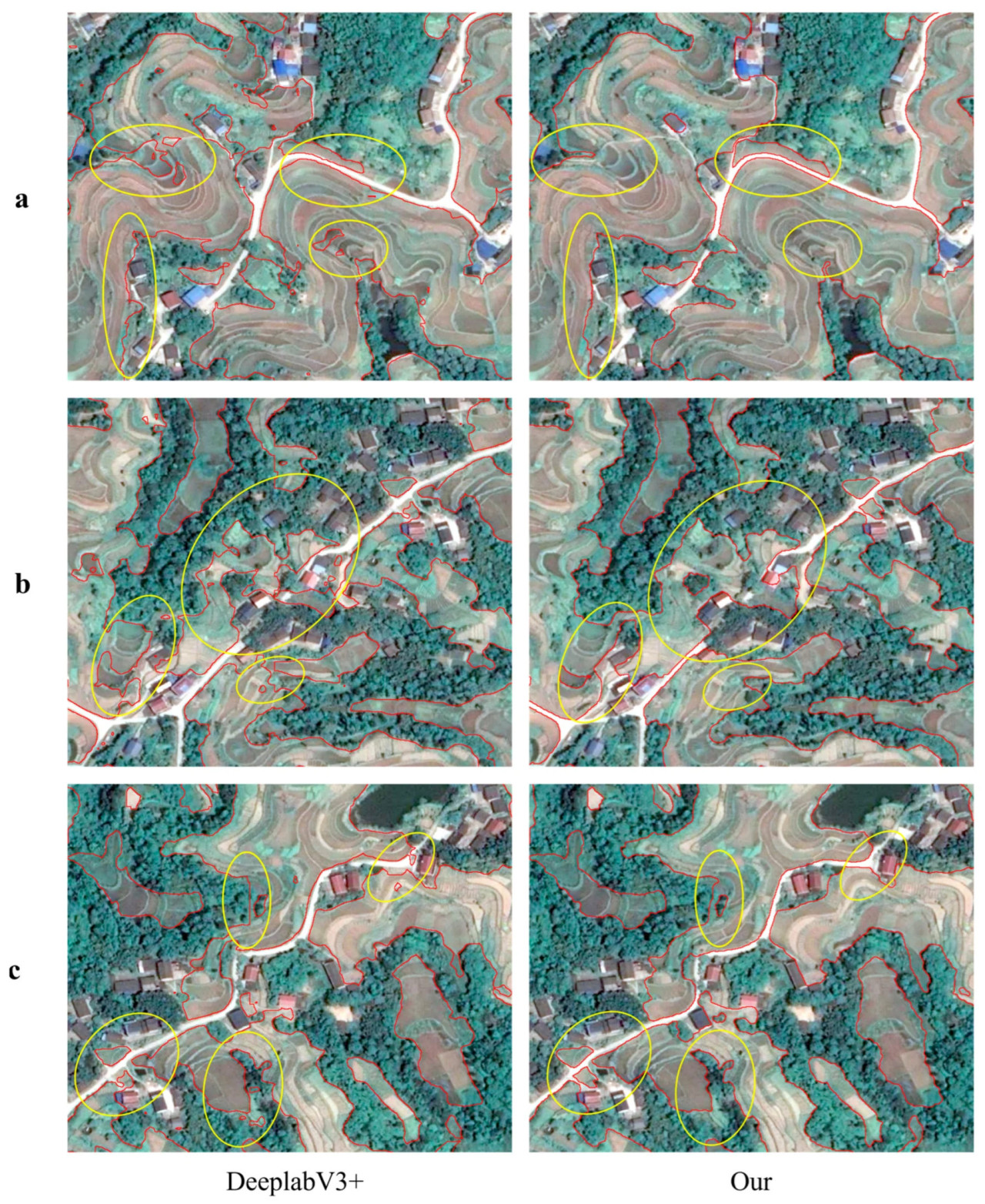 Как показано на Рисунке 12, регионы a, b и c характеризуются сложным рельефом, где сельскохозяйственные земли перемежаются с лесными угодьями и другими типами земель. В результатах выделения базовой модели (DeeplabV3+) в этих регионах неточные границы сельскохозяйственных земель встречаются довольно часто. Например, на террасных полях в регионе a результат выделения имеет ступенчатый вид; вокруг деревень в регионе b наблюдается смещение в определении сельскохозяйственных земель; а на стыке сельскохозяйственных земель и лесов в регионе c их граница смешивается с границей других типов земель. Эти проблемы в определенной степени повлияли на точность и целостность морфологии сельскохозяйственных земель, что привело к неточной статистике площади сельскохозяйственных угодий и более фрагментированной выделенной морфологии по сравнению с реальной.