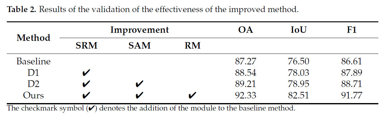 Для проверки наших улучшений мы провели абляционные эксперименты. Используя DeepLabV3+ в качестве базовой линии, мы сначала добавили SRM на этап кодирования, создав метод D1. Затем мы добавили SAM на этап декодирования D1, получив метод D2. Наконец, мы добавили RM к D2, получив метод, используемый в этом исследовании.