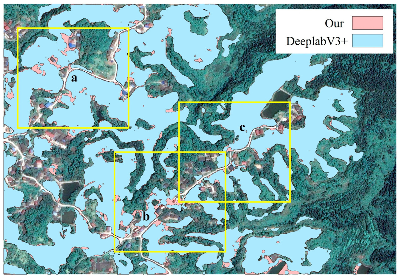 Для дальнейшей проверки выдающейся производительности нашей улучшенной модели в оптимизации морфологии фрагментированных сельскохозяйственных земель мы выбрали изображение, которое никогда не участвовало в процессе обучения, в качестве ключевого проверочного образца. На Рисунке 10 представлены результаты выделения, полученные нашей улучшенной моделью, а на Рисунке 11 показано наложение результатов выделения базовой модели (Deeplabv3+) и улучшенной модели (наша). В целом, сравнивая базовую модель с улучшенной и накладывая их результаты выделения, становится очевидным, что улучшенная модель эффективно решает такие проблемы, как фрагментированные участки и размытые края, которые существуют в базовой модели. Тем временем мы дополнительно показываем детали модели в трех регионах (Рисунок 12), где результаты выделения демонстрируют значительные различия, а именно регионы a, b и c.