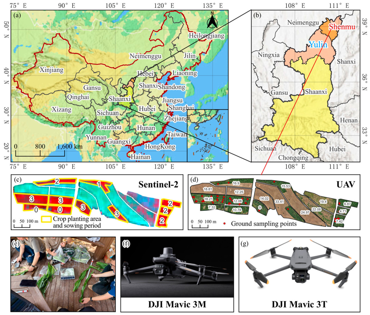 Рисунок 1. Расположение экспериментальной фермы и инструменты, используемые в этом исследовании. (a,b) — уменьшенное и увеличенное изображения расположения района исследования. (c) — ложное цветное изображение района исследования на основе Sentinel-2. Желтая рамка указывает на зону посева кукурузы, а цифры внутри представляют последовательность сева. (d) — истинное цветное изображение района исследования, полученное с помощью дрона. Цифры на каждом участке обозначают площадь участка, единица измерения — му. (e) — фотография места обработки образцов. (f) показывает дрон DJI Mavic 3M, а (g) показывает дрон DJI Mavic 3T.