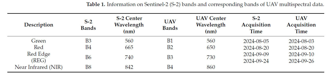В этом исследовании использовались данные спутниковых изображений миссии Sentinel-2. (Рисунок 1c показывает ложное цветное изображение района исследования на основе изображения Sentinel-2) [30]. Sentinel-2 — это высокоразрешающий мультиспектральный спутник для получения изображений. Когда спутниковые системы 2A и 2B дополняют друг друга, период повторного визита составляет 5 дней, а наивысшее пространственное разрешение может достигать 10 м. На основе платформы GEE (Google Earth Engine) [31] был загружен продукт поверхностной отражательной способности Sentinel-2 с временем получения, наиболее близким к времени получения изображения БПЛА, и безоблачный. Учитывая, что пространственное разрешение различных диапазонов данных Sentinel-2 различается, например, пространственное разрешение красного краевого диапазона (B6) составляет 20 м, для повторной выборки обработанных диапазонов до разрешения 10 м использовался метод интерполяции ближайшего соседа. В Таблице 1 представлена соответствующая информация об использованных в статье данных Sentinel-2.