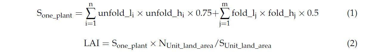 Во время получения изображений БПЛА были собраны полевые измерительные данные образцов (собирались только наземные данные первых трех стадий роста), включая индекс площади листовой поверхности (LAI) кукурузы в районе исследования и GPS-данные точек. Используемыми инструментами были рулетка и RTK i90, а процесс измерения данных показан на Рисунке 1e. Охваченные выборкой стадии роста были стадия смыкания рядов, стадия выбрасывания метелок и ранняя стадия налива зерна. Чтобы обеспечить репрезентативность собранных точек образцов, перед выборкой район исследования был разделен на основе вегетационного индекса, рассчитанного по спутниковому изображению Sentinel-2, а затем были установлены стратифицированные точки выборки в соответствии с площадью каждого раздела [32]. Положения точек выборки показаны на Рисунке 1d. После прибытия в точку выборки выбиралась кукуруза, которая наилучшим образом представляла рост этой области. Информация о положении была получена с помощью RTK. После срезания кукурузы близко к земле все листья были отделены и классифицированы как сложенные и развернутые листья. Были измерены длина и ширина всех зеленых листьев, а LAI был рассчитан в соответствии с формулами (1) и (2) [33].
