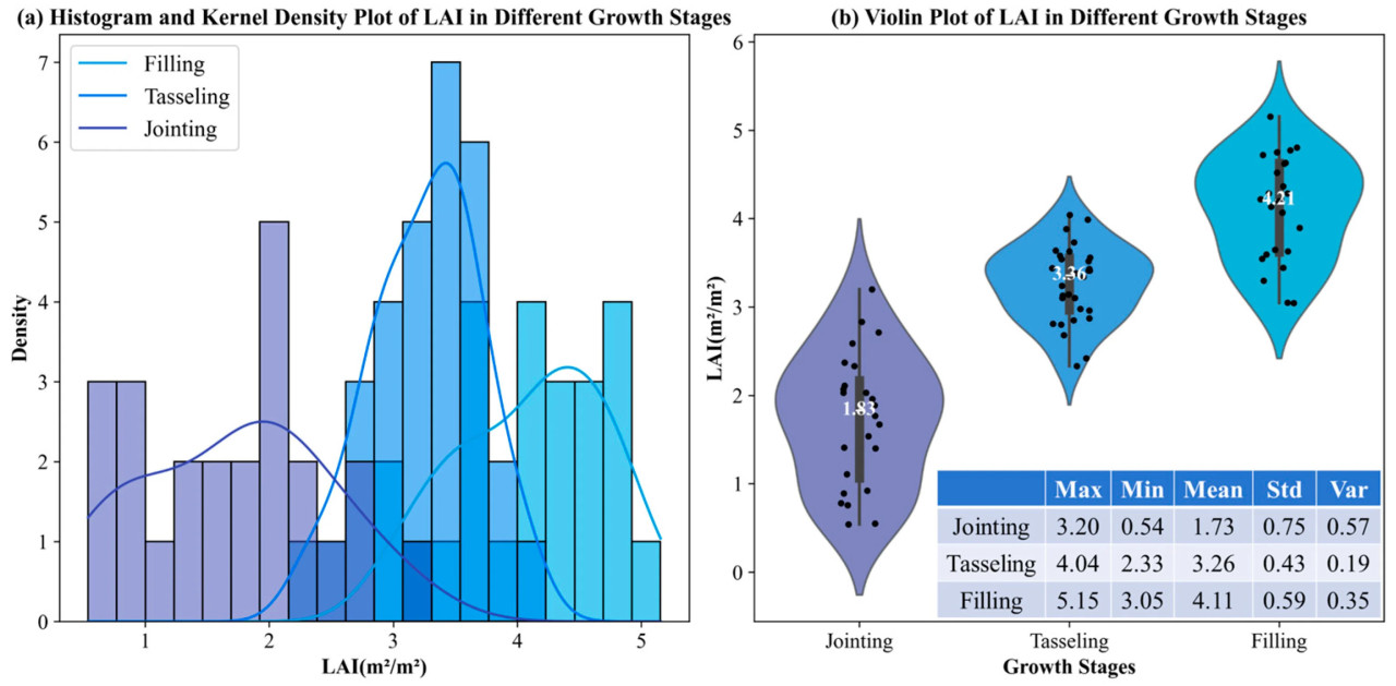 где S_(одно_растение) представляет площадь листьев одного растения, развернутый_лист и развернутая_ширина представляют длину и ширину развернутых листьев соответственно; сложенный_лист и сложенная_ширина представляют длину и ширину сложенных листьев соответственно; n и m представляют количество развернутых и сложенных листьев одного растения кукурузы соответственно; N_(единица_площади_земли) представляет количество растений кукурузы на единицу площади земли; а S_(единица_площади_земли) представляет единицу площади земли. Распределение и основная статистическая информация о значениях LAI, собранных в районе исследования, показаны на Рисунке 2. Значение LAI кукурузы в районе исследования увеличивается по мере стадии роста. LAI на стадии налива зерна в целом находится на высоком уровне с широким диапазоном распределения данных, в основном между 3 и 5. Стадия выбрасывания метелок находится на втором месте, а дисперсия данных наименьшая. Значение LAI на стадии смыкания рядов относительно низкое, и распределение относительно разбросано, со средним значением всего 1,73. Это распределение данных соответствует фактической ситуации роста кукурузы в районе исследования.