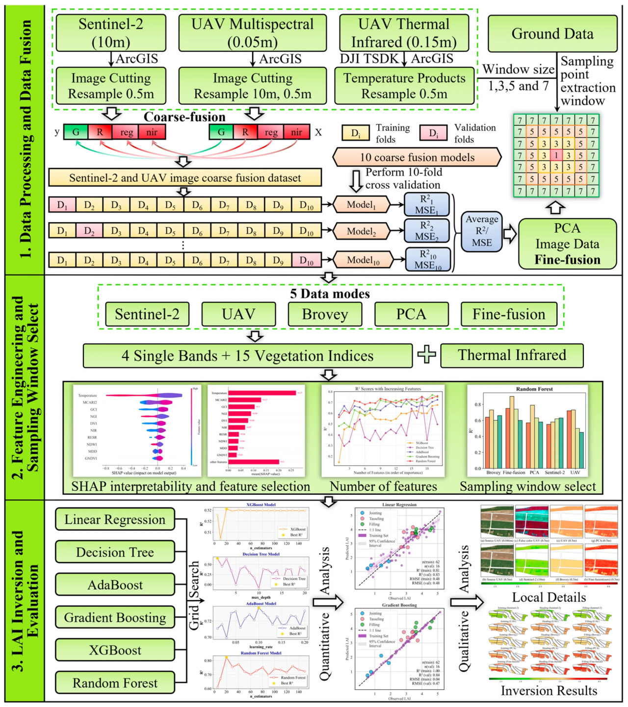 Рисунок 3. Блок-схема интерпретируемого точного инверсионного определения LAI кукурузы путем слияния спутниковых, мультиспектральных изображений БПЛА и тепловых инфракрасных изображений. Этап 1 — это процесс обработки и интеграции данных. Этап 2 — это процесс разработки признаков. Этап 3 — это процесс построения и оценки модели инверсионного определения LAI.