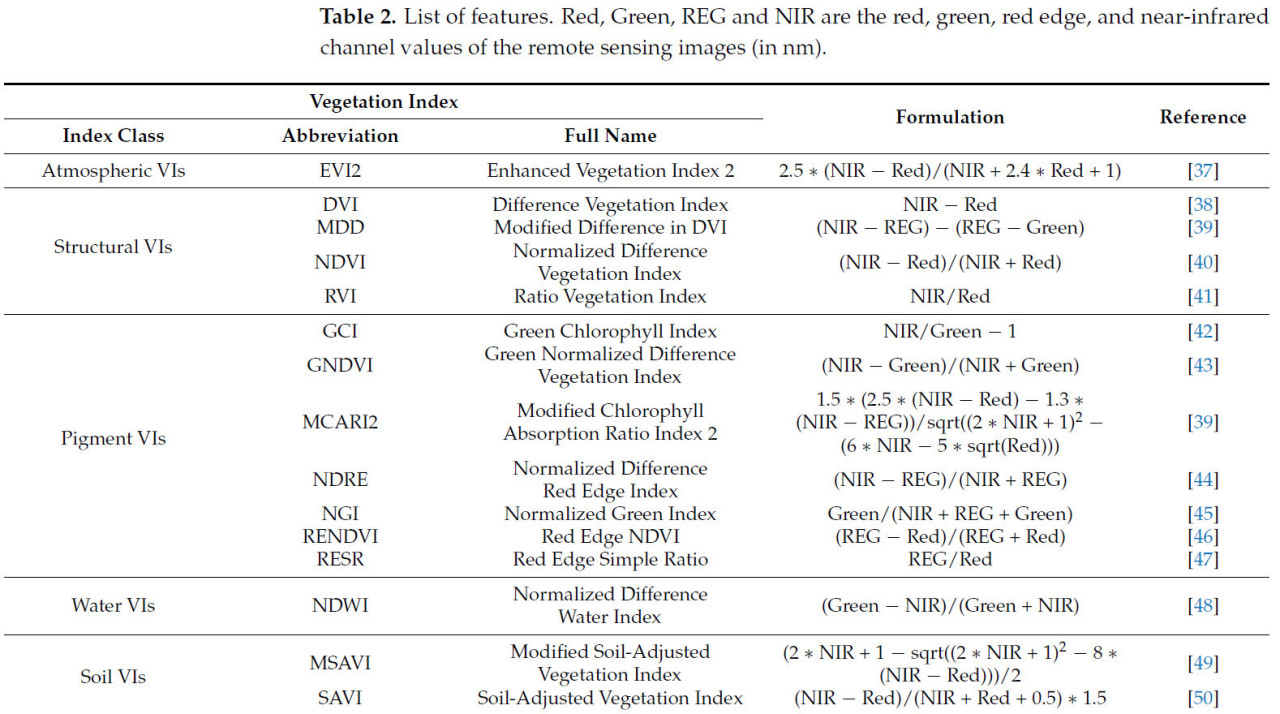 Таблица 2. Список признаков. Red, Green, REG и NIR — это значения красного, зеленого, красного края и ближнего инфракрасного каналов изображений дистанционного зондирования (в нм).