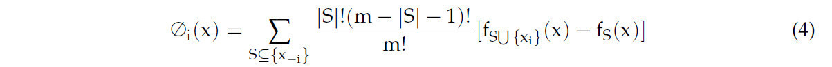 где для i-го признака его SHAP-значение φᵢ(x) равно сумме по всем подмножествам признаков S, не содержащим признак xᵢ, m — общее количество признаков, f_{S ∪ {xᵢ}}(x) — это значение прогноза модели при совместном действии подмножества признаков S и признака xᵢ, а f_S(x) — это значение прогноза модели при действии только подмножества признаков S.