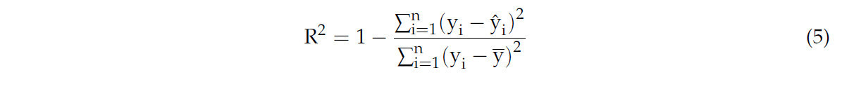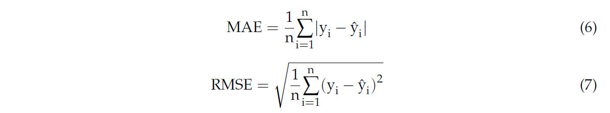 Для всесторонней оценки производительности модели грубого слияния изображений дистанционного зондирования и модели точного инверсионного определения LAI в этой статье выбираются три показателя: R² (коэффициент детерминации), MAE (средняя абсолютная ошибка) и RMSE (среднеквадратичная ошибка). Эти показатели помогают выявить достоверность пространственной спектральной информации после слияния изображений и степень отклонения прогнозируемого значения, а также оценить точность и устойчивость модели при точном инверсионном определении LAI. Формулы расчета R², MAE и RMSE показаны в формулах (5)–(7):