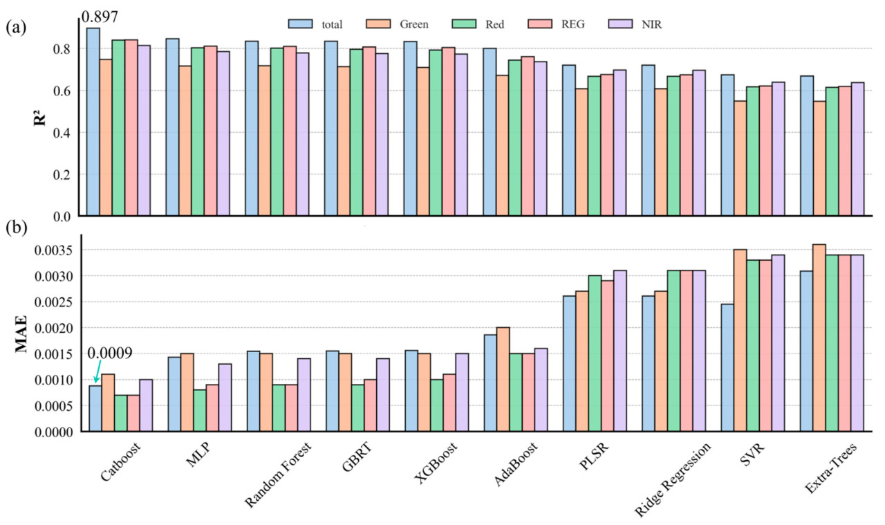 На этапе грубого слияния для поиска спектральной взаимосвязи отображения между изображениями БПЛА и Sentinel-2 используются 10 моделей машинного обучения и ансамблевого обучения, что эффективно интегрирует спектральные характеристики двух источников данных. Модель CatBoost работает лучше всего при грубом слиянии. Эта модель является моделью в рамках фреймворка Gradient Boosting, которая может лучше улавливать взаимодействие между признаками и использует различные методы для предотвращения переобучения, обладая хорошей устойчивостью [61]. При грубом слиянии ее средний R² достигает 0,897, а средний MAE составляет всего 0,0009, что указывает на то, что эта модель может точно отображать спектральные характеристики данных БПЛА в пространство, соответствующее данным Sentinel-2, значительно улучшая спектральное разрешение и информационную насыщенность объединенного изображения. На этапе точного слияния метод PCA используется для извлечения главных компонент на основе статистических характеристик данных, уменьшая избыточность данных и выделяя ключевые пространственные признаки [62]. Объединенное изображение не только сохраняет важную спектральную информацию, но и эффективно снижает шум и помехи, предоставляя более полные и точные данные для модели инверсионного определения LAI и значительно улучшая точность инверсии и достоверность деталей.