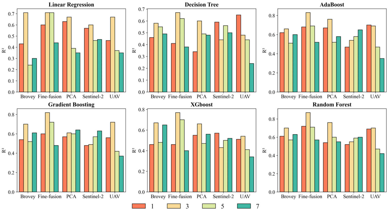 На Рисунке 5 иллюстрируются влияния различных масштабов окон выборки признаков, режимов данных и моделей на модель инверсионного определения LAI. Анализ показывает, что применимые окна выборки различаются в различных режимах данных. За исключением режима данных Sentinel-2, большинство других режимов данных достигают наилучших результатов при использовании масштаба окна 3×3 для инверсионного определения LAI с разными моделями. Когда окна выборки равны 5 и 7 соответственно, их покрытие относительно велико. В результате пространственные детали признаков сглаживаются из-за вычисления среднего значения, что ослабляет способность модели улавливать детальные изменения и снижает согласованность с диапазоном точек выборки. Поэтому в этом исследовании для окончательного точного инверсионного определения LAI выбирается окно выборки 3×3.