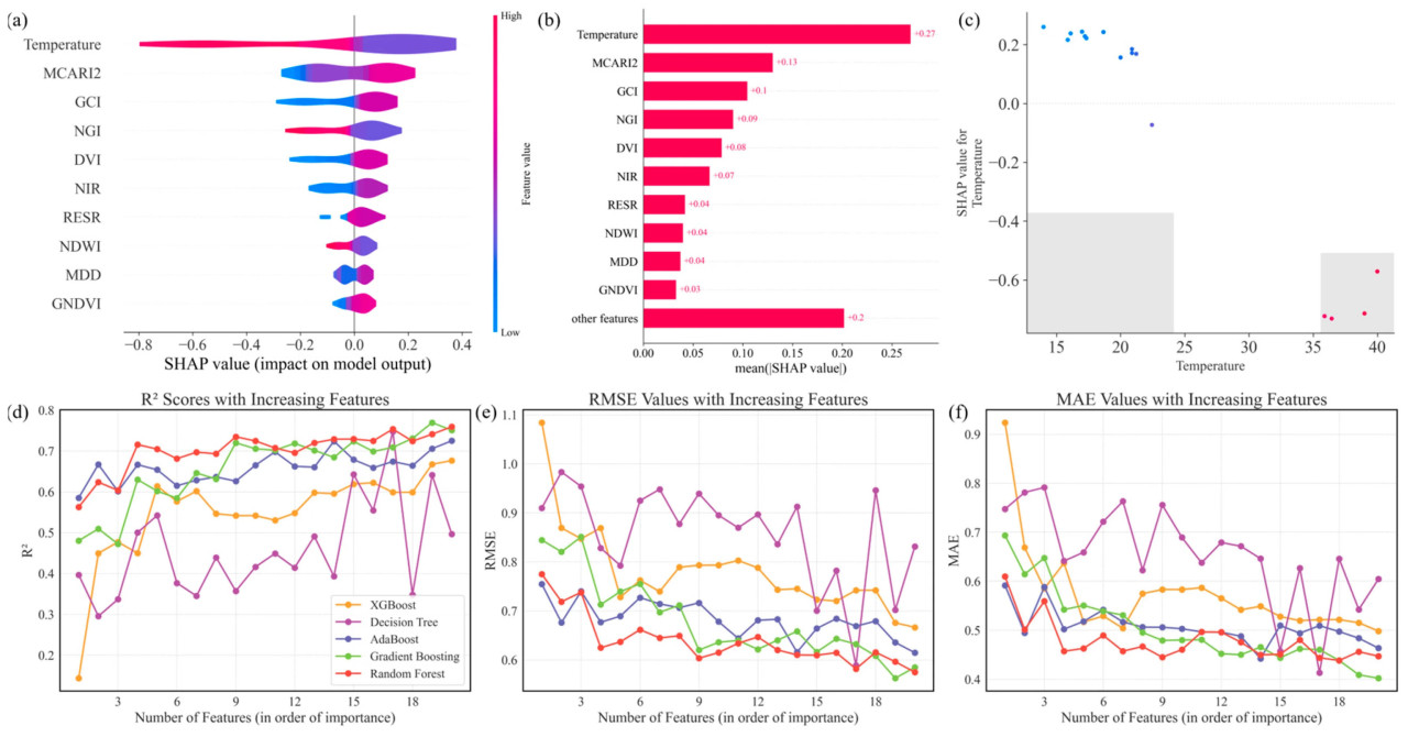В этом исследовании обнаружено, что с увеличением количества признаков производительность каждой модели сначала увеличивается, а затем стремится к стабилизации, что показано при сравнительном анализе влияния количества признаков на точность модели (Рисунок 6d–f). Стабильность Decision Tree относительно низкая, а стабильность XGBoost и AdaBoost иногда колеблется. Стабильность Random Forest и Gradient Boosting выше, и изменение точности относительно плавное с увеличением количества признаков. Когда количество признаков равно 9, хотя точность не самая высокая, она также относительно хорошая. Учитывая такие факторы, как точность, способность к обобщению, устойчивость и эффективность работы модели, в этом исследовании для точного инверсионного определения LAI используются 9 признаков, а именно: Temperature, MCARI2, GCI, NGI, DVI, NIR, RESR, NDWI и MDD. Окончательно определенная комбинация признаков включает не только такие признаки вегетационных индексов, как структурный вегетационный индекс и пигментный вегетационный индекс, но также учитывает температуру полога и спектральную информацию, что подтверждает эффективность SHAP в фильтрации признаков.
