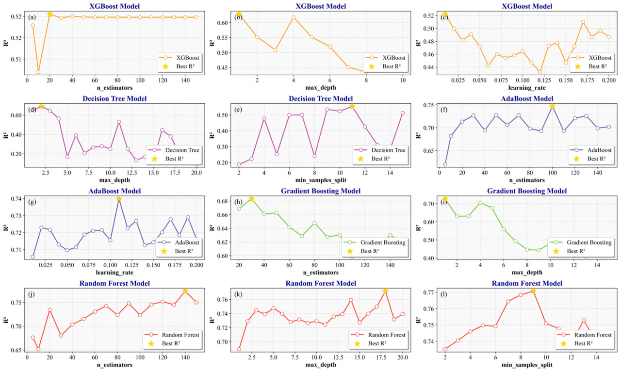 Для дополнительной оптимизации конфигурации гиперпараметров каждой модели инверсионного определения LAI в этой статье используется метод поиска по сетке и настраиваются ключевые гиперпараметры каждой модели, включая максимальную глубину дерева (max_depth), скорость обучения (learning_rate) и количество оценщиков (n_estimators). Результаты показаны на Рисунке 7, где представлена точность каждой модели при применении разных гиперпараметров. Золотая звезда указывает на оптимальное значение определенного гиперпараметра для определенной модели.