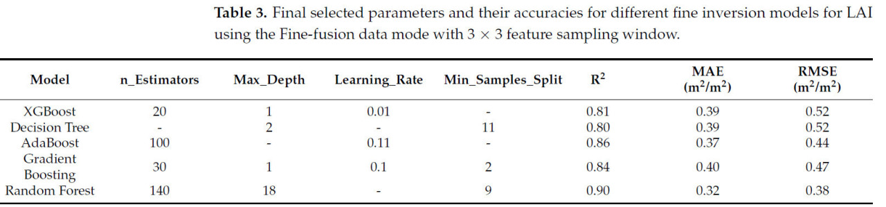 В Таблице 3 представлены окончательные оптимизированные комбинации гиперпараметров и соответствующие им показатели точности для каждой модели на основе режима данных Fine-fusion и окна выборки признаков 3×3. В сочетании с Рисунком 7, каждая модель достигает улучшения точности и стабильности при оптимальной конфигурации параметров. В качестве примера рассмотрим модель Random Forest: она достигает наилучшего эффекта при конфигурации параметров n_estimators = 140, min_samples_split = 9 и max_depth = 18, с R², достигающим 0,90, а значения MAE и RMSE составляют 0,32 м²/м² и 0,38 м²/м² соответственно. Для моделей AdaBoost и Gradient Boosting их производительность также может быть незначительно улучшена путем настройки гиперпараметров. В целом, путем настройки гиперпараметров каждой модели с помощью поиска по сетке можно улучшить показатели R², MAE и RMSE каждой модели, и каждая модель может оставаться относительно стабильной при оптимальной комбинации гиперпараметров.