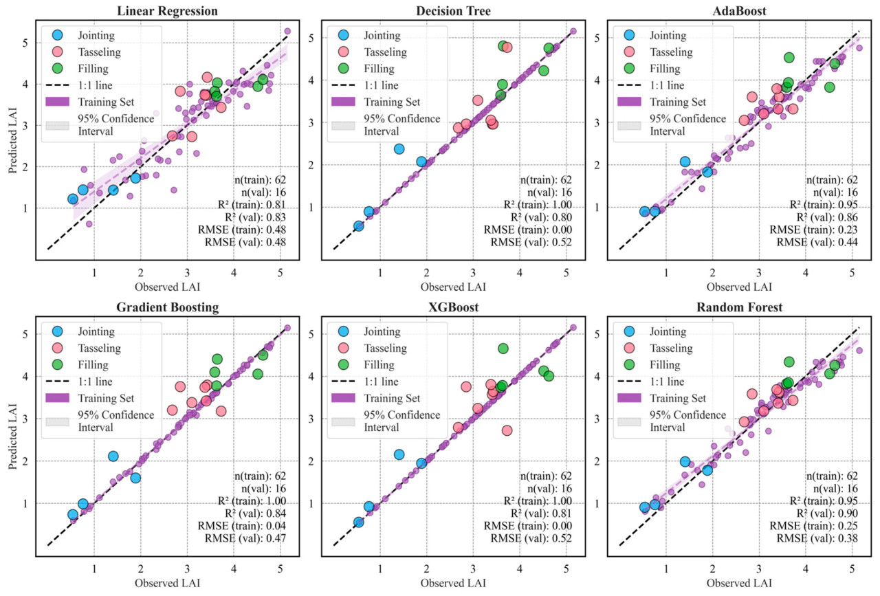 При количественной оценке производительности модели точного инверсионного определения LAI мы используем оптимальное окно выборки признаков, оптимальную комбинацию признаков и оптимальные гиперпараметры модели, а также обучаем и валидируем модель с соотношением обучающей выборки к валидационной 8:2. Как показано на Рисунке 8, модели интегрированного обучения, такие как Random Forest, AdaBoost и Gradient Boosting, демонстрируют относительно высокую точность аппроксимации на протяжении всей стадии роста. Однако R² Decision Tree, Gradient Boosting и XGBoost достигает 1 во время обучения, что указывает на то, что эти модели имеют определенный риск переобучения. Модель линейной регрессии относительно проста и ее легко не переобучить даже при небольшом объеме данных, но точность модели относительно низкая. Точность обучения и точность валидации AdaBoost и Random Forest не сильно различаются, что указывает на то, что эти модели имеют относительно более сильную способность к обобщению, лучшую устойчивость и относительно более высокую точность. Среди них R² алгоритма Random Forest во время обучения составляет 0,95, а RMSE — 0,25 м²/м². R² во время валидации составляет 0,90, а RMSE — 0,38 м²/м², что демонстрирует высокую точность, способную удовлетворить потребности точного инверсионного определения LAI кукурузы.